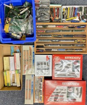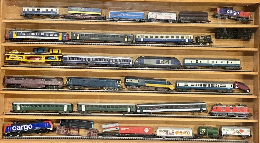 N GAUGE MODEL RAILWAY EQUIPMENT, AN EXTREMELY LARGE COLLECTION, including over 250 individual trains, carriages and rolling stock, the majority in original boxes, makers include Fleischmann, Minitrix, Roco, Arnold, Bertren, Hornby, Fleischmann start set and 9380 ice start set, Lima mini train boxed set, a quantity of Lone Star Diecast, large quantity of track, boxed and unboxed and a large quantity of various buildings, layout material, cars, animals, people ETC