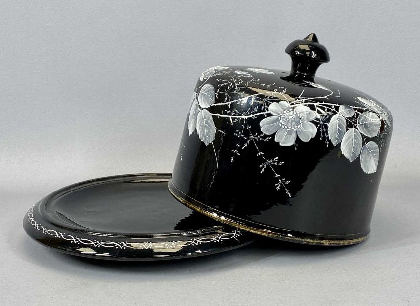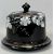 ROSSLYN JET VICTORIA BLACK POTTERY CHEESE DOME & BASE with enamelled floral decoration, 23cms overall H, 26.5cms diam. the base
