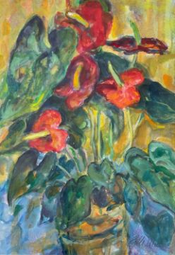 ‡ GLORIA (GLO) WILLIAMS four artworks - graphite on paper, entitled, 'Plain Betty' on Albany Gallery label, signed, 44 x 59cms, a watercolour, untitled, anthurium flowers in a pot, signed, 65 x 45cms, an oil on board, untitled, portrait of a young woman, signed, 26 x 21cms and a pencil sketch on paper of a female figure, signed, 14 x 14cms (4)Provenance: Private collection DevonComments: Framed and glazed