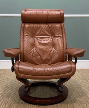 PAIR EKORNES STRESSLESS SWIVEL RECLINER ARMCHAIRS, brown leather upholstery, adjustable headrest, classic base. 100 (h) x 75cms (w) (2)Provenance: private collection south WalesComments: upholstery with considerable wear, tears and cracks to one chair, ring base split to same chair, inspection advised