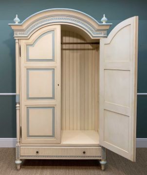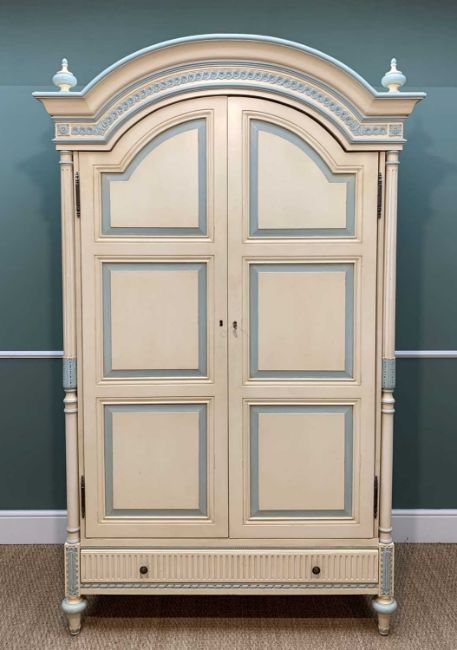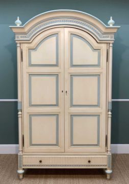 'AND SO TO BED' FRENCH STYLE PAINTED ARMOIRE, cream with pale blue detailing, 226 (h) x 140 (w) x 61cms (d)Comments: good used condition, no apparent damage, looks to have some decorating 'over-spray' (please refer to last images)