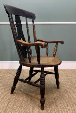 19TH C. WELSH BEECH LATHE-BACK ARMCHAIR, probably Vale of Glamorgan, inverted heart shaped splat, circular saddle seat, turned legs and spingles, double H-strecherProvenance: private collection CardiffComments: nicely patinated.