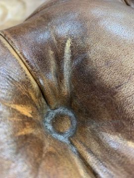 'FLEMING & HOWLAND' LEATHER CHESTERFIELD SOFA, three loose cushions, turned front legs, castors, 200 (w) x 92cms (d)Provenance: private collection CardiffComments: ordinary used condition, cushions faded.