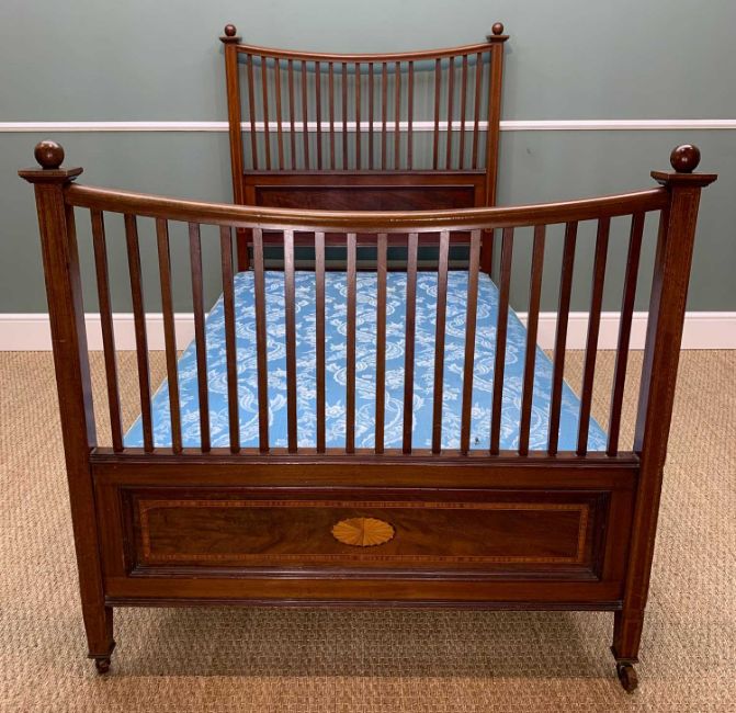 TWO ANTIQUE BEDS, comprising Edwardian Sheraton-style mahogany and satinwood crossbanded single bed, 3'6'' wide; and HEAL & SONS of LONDON brass small single bed, 3'1'' (w) both with bases (2)Provenance: private collectionComment: wood bed with one slat missing from headboard, brass worn