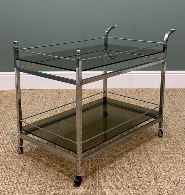 VINTAGE CHROME AND GLASS DRINKS TROLLEY, circa 1970s, smokey glass trays within rails, castors, 68 (h) x 87 (w) x 48 (d)