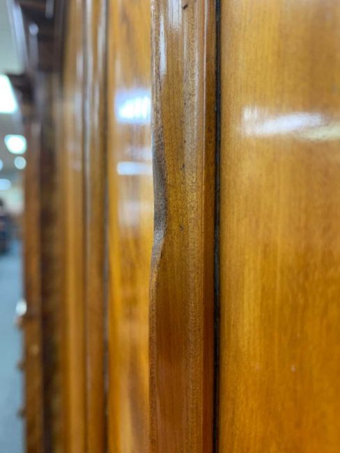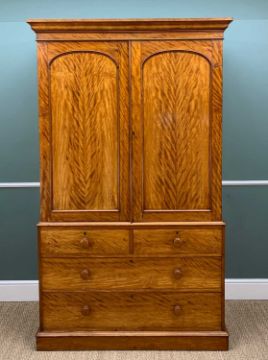 VICTORIAN SATIN BIRCH LINEN PRESS, en suite to the previous lot, fitted linen slides and drawers, chestnut interior, 213.5 (h) x 128cms (w)Provenance: private collection ShropshireComments: minor loss and shrinkage to arch mouldings, general wear but good overall