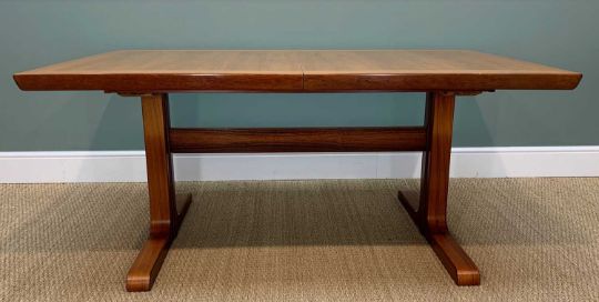 DANISH SKOVBY TEAK EXTENDING DINING TABLE, with cleated edges on trestle end supports, 165 (w), 215 (w) extended x 100cms (d)Provenance: consigned via west WalesComments: heat stain to leaf, minor water ring marks