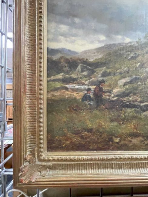 JOHN SYER (1815-1885) oil on canvas - 'Trout Fishing, Breconshire', a Welsh river landscape, The Lower Nupend Gallery label verso, titled, signed and dated '82, 44 x 60cmsProvenance: private collection LeicestershireComments: painting cleaned, some canvas visible by the clay embankmant and river side rocks, canvas relined, framed, ready to hang