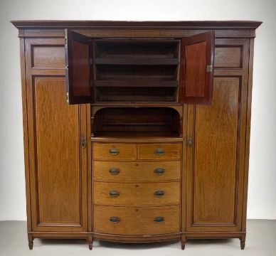 SHERATON STYLE MARQUETRY COMPACTUM, early 20th C., inlaid and strung, hanging spaces flanking slides over two short and three long graduated drawers, 224h x 220w x 59cms dProvenance: private collection CardiffComments: one door handle damaged (but parts present), minor chips and general wear, inspection advised