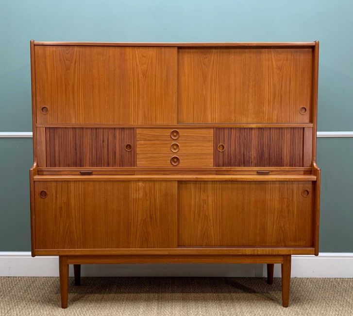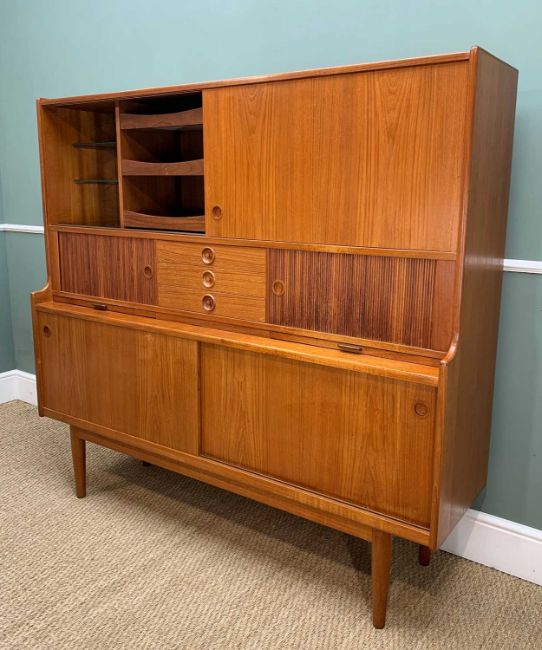 JOHANNES ANDERSON FOR ULDUM MOBELFABRIK: Danish teak cabinet, c. 1960s, fitted three registers of sliding panel and tambour cupboards and shelves, three drawers, drinks slides, tapering circular legs, 151 (h) x 160 (w) x 43cms (d)Provanance: private collection Vale of GlamorganComments: Danish control sticker to rear, generally very good, water stain to top of unit, minor faded patch to one door. NB this unit is reasonably heavy and is constructed as one piece.