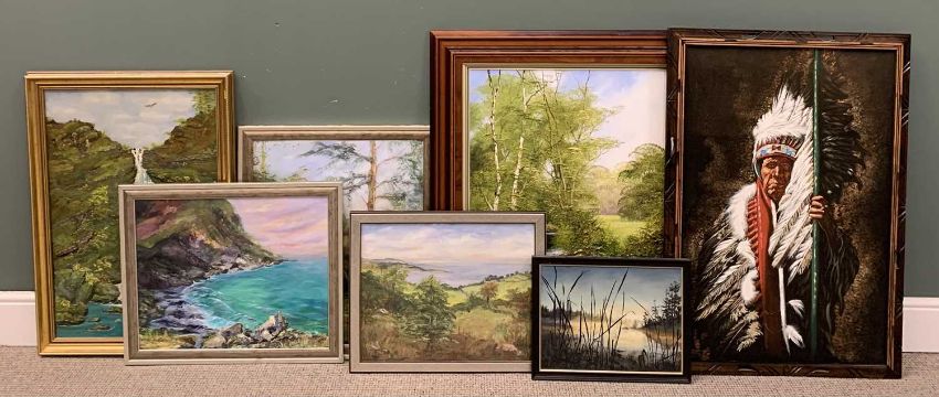 JAIN KOFFLER BA (BRITISH) & other paintings, comprising a waterfall study oil on canvas, 75.5 x 50cms signed and dated 1999 & three oils on board, North Wales coastal scene titled verso `Farm in Llanfairfechan North Wales`, 39.5 x 50cms, rocky inlet with stoney beach titled verso `Angel Cove Penrhyn Bay North Wales`, 45 x 55cms, misty lake with rushes to the foreground, 29.5 x 39cms, the former three signed by the artist, large unattributed oil on canvas of a country meadow with silver birch by a stream, 75 x 60cms, unattributed oil on board similar composition, 60 x 50cms and an unattributed watercolour on velvet canvas depicting an Indian warrior chief in full headdress with spear, 91 x 59.5cmsProvenance: deceased estate ConwyComments: all framed, one framed and glazed