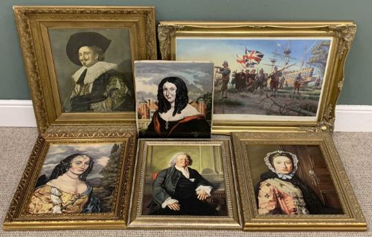 CONTEMPORARY PORTAIT PAINTINGS AND PRINTS GROUP comprising four classically styled portrait studies of three various ladies and a gentleman, 46 x 38cms, one unframed, after FRANS HALS print of The Laughing Cavalier, 48 x 38cms and MORT KUNSTLER American print titled `Jamestown May 14 1607` group scene depicting the first English settlers arriving in North America, 49 x 75cmsProvenance: deceased estate AngleseyComments: all but one in contemporary gilt frames, the two prints framed and glazed