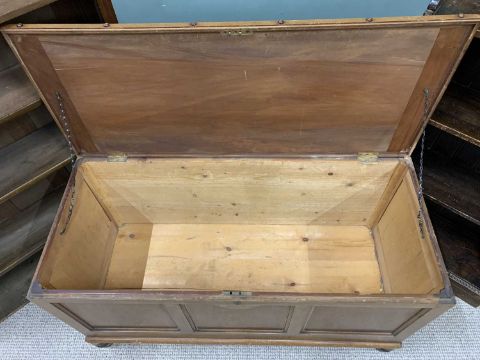 THREE VINTAGE FURNITURE ITEMS comprising, oak open bookcase, four fixed shelves, bobbin detail, plinth base 107 (H) x 61 (W) x 24cms (D), mahogany bookcase top, open fronted with three interior adjustable shelves 108.5 (H) x 97 (W) x 26.5cms (D) lidded blanket chest, panelled front and sides, turned supports, 62 (H) x 107 (W) x 46cms (D)Provenance: private collection Anglesey