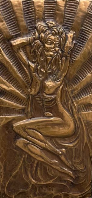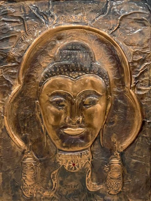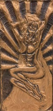 JAIN KOFFLER BA (BRITISH) FIVE REPOUSSE COPPER PANELS, one showing an image of Buddha, 59 x 43cms, two showing triple panels of Indian deities, 43 x 58.5cms and 43.5 x 58.5cms, two panels showing seated naked females, 60 x 29cms and 58.5 x 28cmsProvenance: deceased estate ConwyComments: all mounted on board
