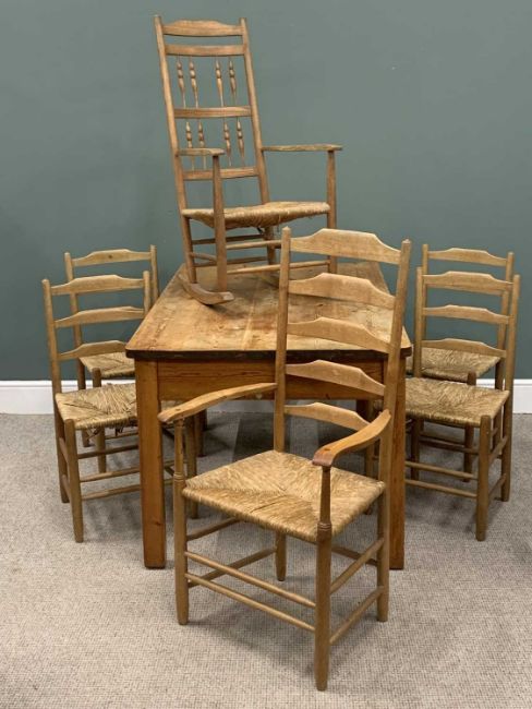 PINE KITCHEN TABLE & SIX (4+1+1) LADDER-BACK RUSH SEATED CHAIRS comprising one carver/armchair, 115 (H) x 59 (W) x 41cms (seat depth), four open chairs and a similar but spindle-backed rocking arm chair, 108 (H) x 54 (W) x 45 (seat depth) x 66cm (L) rockers, 78 (H) x 152 (L) x 90cms (W) tableProvenance: private collection Anglesey