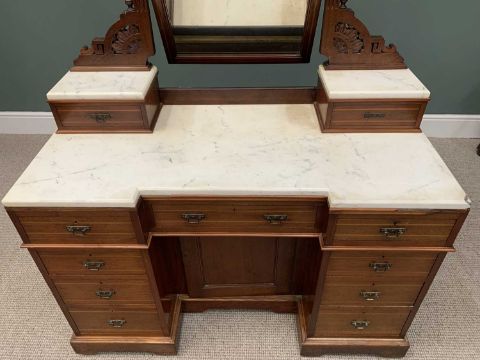 WHITE MARBLE TOP MAHOGANY MIRRORED DRESSING CHEST circa 1900, central rectangular mirror, turned and carved gothic-style supports on twin marble topped single drawer pedestals, base with inverted breakfront chamfered edge marble top, arrangement of nine opening drawers, central kneehole cupboard door, plinth base with castors, 157 (overall height) x 123 (W) x 55cms (D)