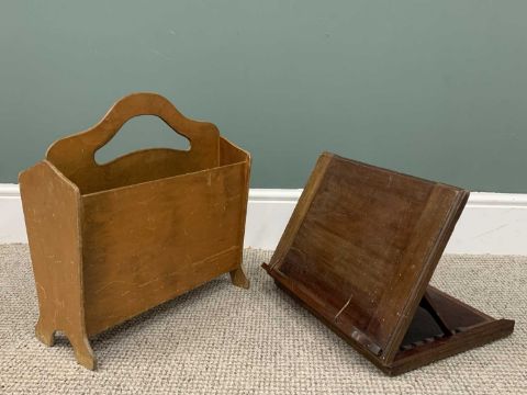 FIVE ITEMS OF VINTAGE & LATER FURNITURE to include a lightwood counter-top bank of twelve opening drawers, brass effect knobs, 43 (H) x 87 (W) x 32cms (maximum depth), pitch pine two-tier trolley, 71 (overall height) x 83.5 (L), 45cms (W), similar wood stool, brown leather effect top, 61 (H) x 37 (W) x 39cms (D), mid-century magazine rack, Victorian mahogany book stand with ratchet type easel back, 40 x 30cmsProvenance: private collection Anglesey