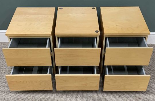 FOUR PIECES OF MODERN LIGHTWOOD BEDROOM FURNITRE comprising a long chest of six drawers, 77.5 (H) x 160.5 (W) x 48.5cms (D) and three matching two-drawer bedside cabinets, 55 (H) x 40 (W) x 48.5cms (D)Provenance: deceased estate Conwy