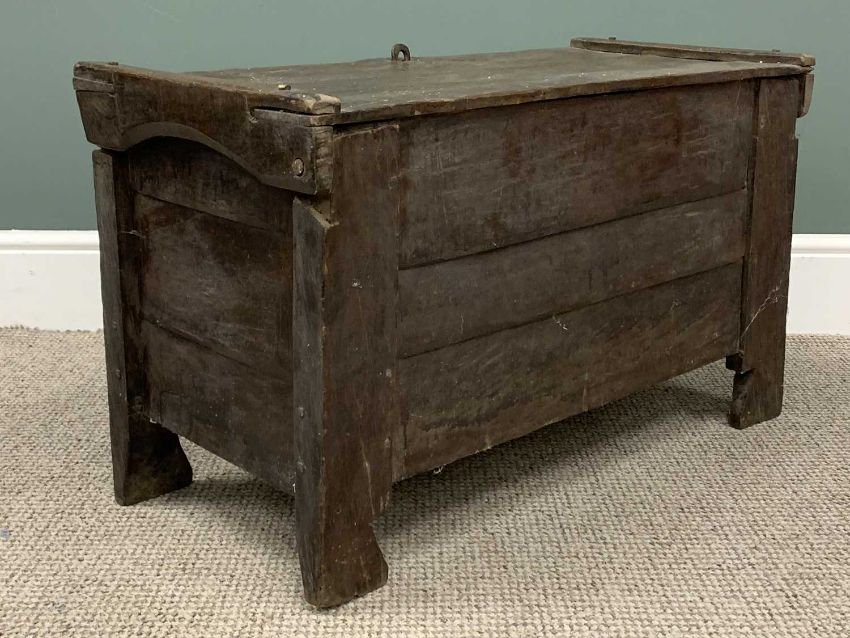 LATE 18TH/EARLY 19TH CENTURY CARPATHIAN SHEPHERD CHEST, primitive hewn timber, possibly beech, peg joined construction with traditional Eastern European carved motifs, to ward off evil spirits,48 (H) x 82 (W) x 36cms (D)Provenance: deceased estate Anglesey
