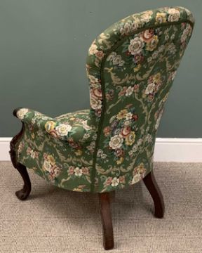 VICTORIAN CARVED MAHOGANY SPOONBACK ARMCHAIR green and floral upholstery, knurled arm ends, leaf-carved details to the knees, knurled front supports, 109 (H) x 66 (W) x 63cms (seat depth)Provenance: deceased estate Anglesey
