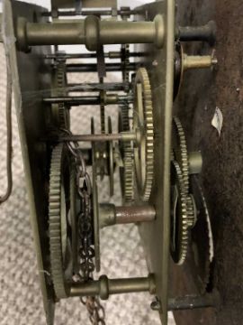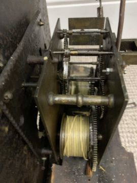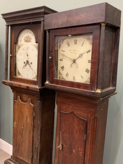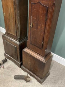 TWO EARLY 19TH CENTURY OAK LONGCASE CLOCKS, comprising an arched top fruit painted dial, Arabic numerals, marked Evan Evans before a single weight pendulum driven bell strike movement (weight and pendulum included), the other having a 12 inch square painted dial, Roman Numerals, marked Edward Matthers, chain driven single weight pendulum bell strike movement (weight and pendulum included), for repair or restoration, parts and cases possibly marriages, 194 (H) x 47.5cms (W) and 189 (H) x 49cms (W) measurements respectivelyProvenance: deceased estate Anglesey