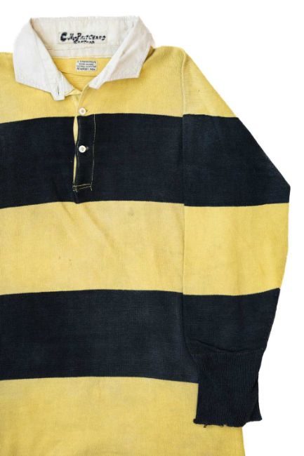 A CIRCA 1906-1909 NEWPORT RFC CAPTAIN'S JERSEY MATCH-WORN BY CHARLES MEYRICK PRITCHARD (1882-1916)Hooped black and amber jersey with white collar, two buttons and interior label for A Simmonds, Newport, label to collar inscribed ‘C M PRITCHARD – CAPTAIN’.Preserved with other important jerseys, caps and photographs by Charles Meyrick Pritchard (1882 – 1916) which form a collection entered to this auction by Charlie Pritchard’s great-grandson. In recent years the collection has been archived and exhibited at the World Rugby Museum at Twickenham Stadium.The Newport club was an important source for fine Wales internationals before the First World War, Wales's first golden era. The club was substantial in stature and reputation thus the start of the 20th century saw touring sides from the southern hemisphere as regular visitors to Rodney Parade. In 1912, Newport became the first ever club side to beat Bill Millar's South African team. This was the era of Walter Martin, J. E. C. Partridge, Reg Plummer, Reg Skrimshire, Tom Smythe, Tommy Vile etc. Skrimshire was Newport's first ever British Lion in 1903 and since that time they have provided a total of 31 players on overseas Lions tours. In 1910, Dr. Tom Smythe was selected to captain the Lions to South Africa along with 6 fellow Newport players. But it was Charlie Pritchard who stood most prominently in the first decade of the new century.Newport RFC was for Charlie Pritchard a family affair. His father was a founding member of the club. And at the age of eighteen in 1902, Pritchard enjoyed his debut match for Newport in a 6-3 victory away against Swansea, with his cousin Cliff Pritchard scoring a try.Between 1901 and 1911, Pritchard went on to make 217 appearances for Newport and score 63 points. He was described as 'the most enduring of influences upon the fortunes of the club' and elected captain for 1906/1907 season, during which 27 matches were played, 13 won, 7 lost and 7 drawn. In ‘Newport Rugby Football Club, 1875-1960’ (published by Newport Athletics Club, 1960), author Jack Davis remarked that ‘…Pritchard as a captain was not at the highest level but he was a great forward, and he was the most lovable of all the Newport captains I have known. On the field he was a lion; off the field he was one of the tenderest and sweetest of men. There was a quality of gentleness in his manner, a note of affection in his voice, and great a player as he was, one thinks of him as a good comrade, a genial companion’.Captain Charles Meyrick Pritchard, 12th Battalion (3rd Gwent), the South Wales Borderers, died at Chocques in France from wounds received two days earlier during the fighting at Loos. He was one of thirteen Wales international players to be killed during the Great War. In May of 1915 he joined the South Wales Borderers, and after six months had been promoted to captain. His battalion arrived on the Western Front in June of 1916. On the night of the 12th of August, Captain Pritchard led a raiding party near Loos. Although the raid was successful, he was wounded at the outset but carried on only to be more seriously wounded later. He was taken to No. 1 Casualty Clearing Station, a few miles behind the front lines, but could not be saved. The 12th South Wales Borderers War Diary recorded: “The Battalion thus loses a very gallant officer and a chivalrous, generous and large-minded gentleman.” He was mentioned in despatches, and had he survived he would have been recommended for the Distinguished Service Order for his bravery – at that time the D.S.O. was not awarded posthumously.On hearing of Captain Pritchard’s death, the journalist W.J. Townsend Collins wrote: “The war has swept away many a great and famous Rugby player who was also a good fellow; but among them all was none with a stouter or kinder heart, more beloved, more lamented than Charlie Pritchard.” He is buried in the Chocques Military Cemetery, three miles north-west of Béthune.Charles Meyrick Pritchard, former Welsh international rugby player, Newport RFC captain, local wine merchant, husband and father of two sons, was just 33 years old.