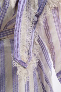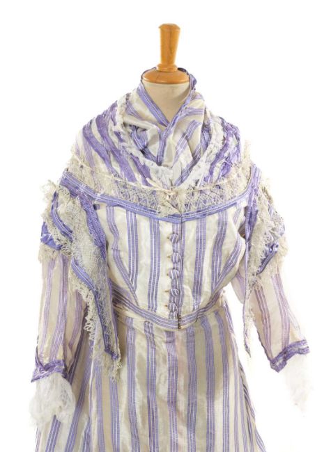 VICTORIAN STRIPED MAUVE & WHITE SILK DAY DRESS, with buttoned over boddice with tabs, sleeved bodice and skirt, lace trimProvenance: private collection Cardiff.