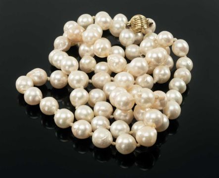 SINGLE STRAND CULTURED PEARL LONG NECKLACE, with 9ct gold reeded ball clasp, pearls appr. 10mm diam., 94g., 91.5cms longProvenance: private collection MonmouthshireComments: worn patina, all pearls blistered.