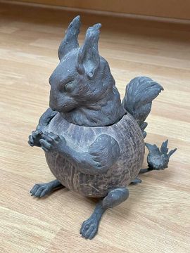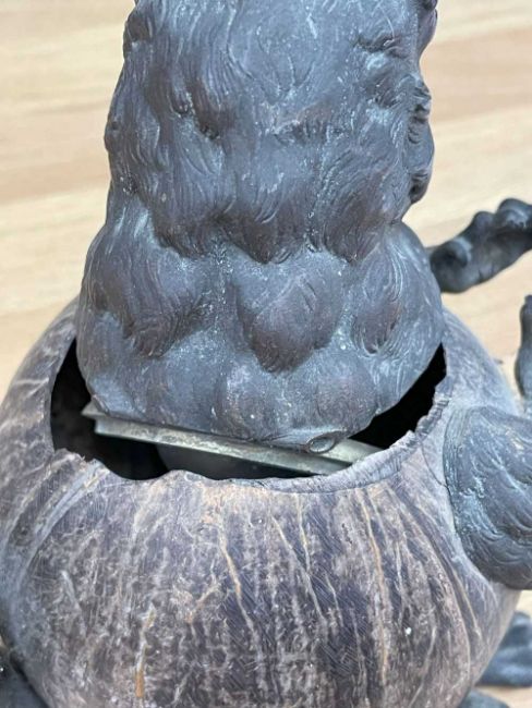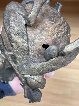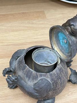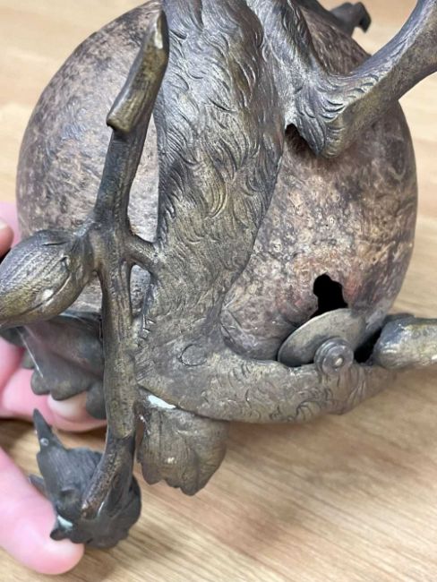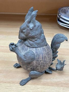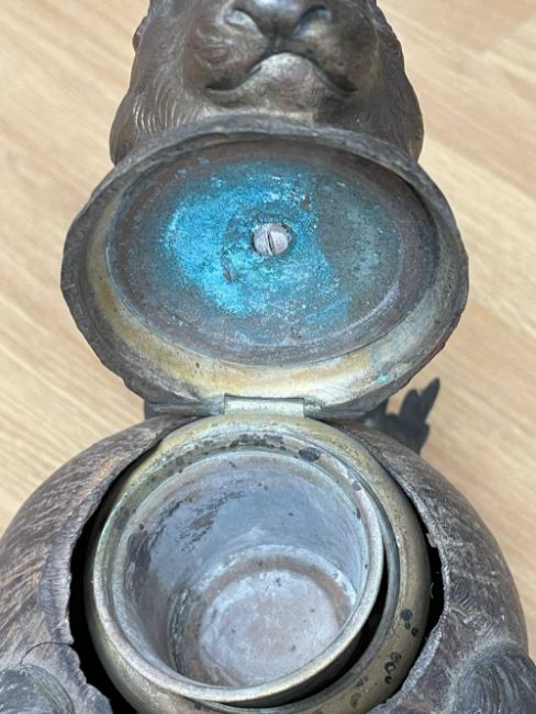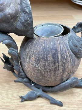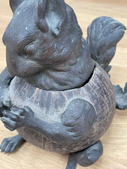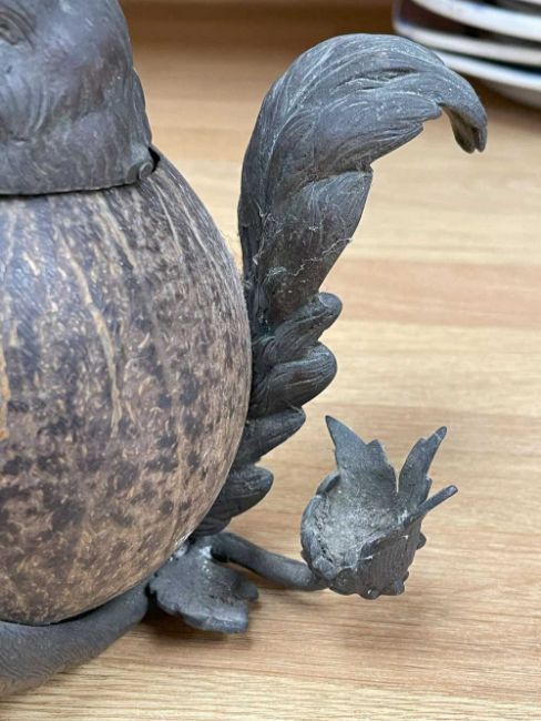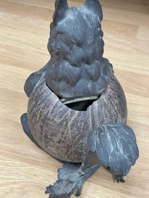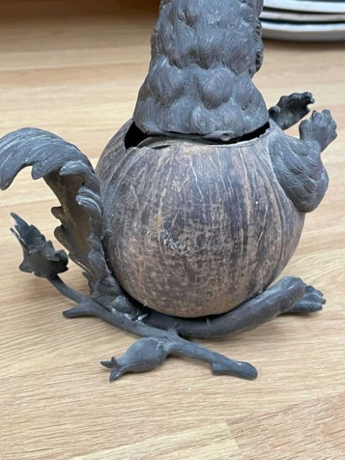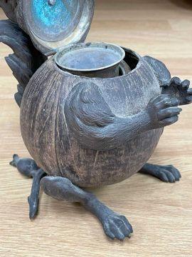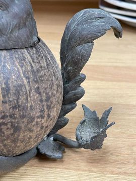 regarding the squirrel inkwell, the coconut has chips around where the inkwell would sit. It all feels loose. All the metal looks good and the hinge is fine.