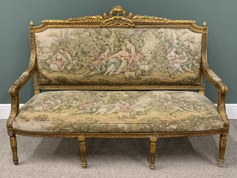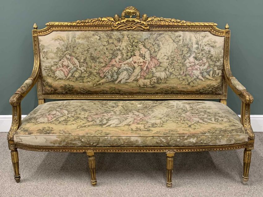 EMPIRE STYLE TWO PIECE GILT WOOD SALON SUITE comprising three seater settee and armchair, fancy crest details, moulded detail frames, curled arm ends, tapestry style upholstered backs and seats, reeded supports, 114.5 (h) x 166 (w) x 70cms (d) and 109 (h) x 65.5 (w) x 56cms (seat d) respectivelyProvenance: private collection Conwy