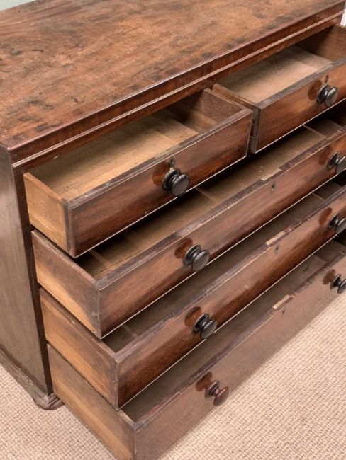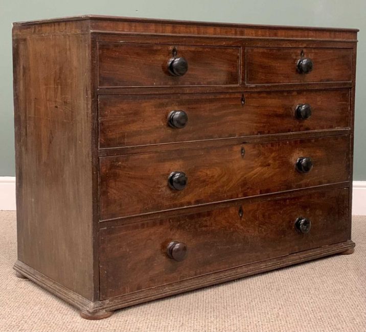 GEORGIAN MAHOGANY CHEST, two short, three long oak lined drawers, cockbeaded edging, ebony escutcheons, replacement knobs, squat bun feet, 88 (h) x 122 (w) x 56cms (d)Provenance: private collection Gwynedd