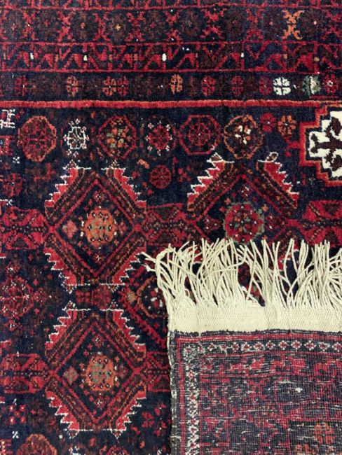 EASTERN WOOLEN RUG, red ground, repeating central diamond block pattern, multi bordered edge, tassled ends, 190 x 99cmsProvenance: deceased estate Gwynedd