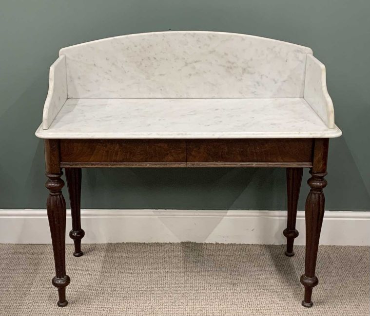 VICTORIAN MAHOGANY MARBLE STOP WASHSTAND, shaped splashback and top in white marble, twin frieze drawers, fluted tapering turned supports, 101 (overall h), 107 (w) x 51cms (d)Provenance: private collection Denbighshire