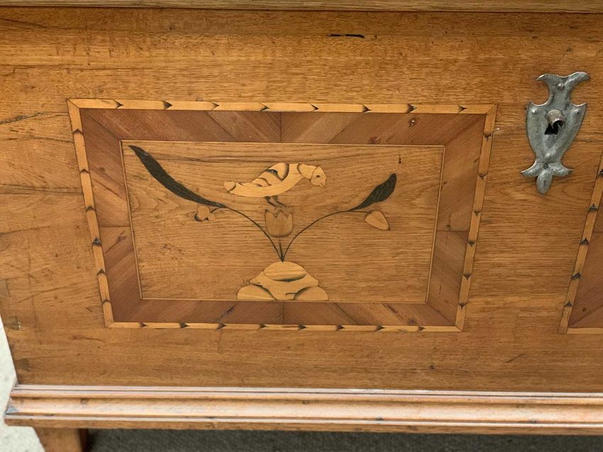 ANTIQUE OAK BLANKET CHEST, pokerwork and crossbanding, iron side carry handles, stile feet, 67 (h) x 115 (w) x 66cms (d)Provenance: private collection Conwy