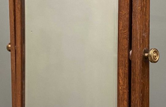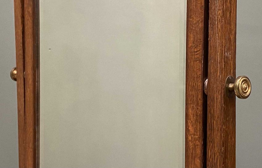 VINTAGE OAK CHEVAL DRESSING MIRROR, bevelled edge glass, brass tightening knobs, splayed supports, metal castors, 158(h) x 51(w) x 50cms(d)Provenance: deceased estate Gwynedd