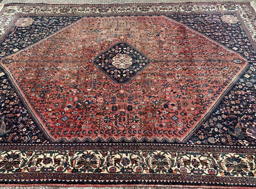 PERSIAN RED GROUND WOOLEN RUG, traditional design large central diamond block, bird and animal pattern corners, continuous triple bordered edging, tassled ends, 302 x 207cmsProvenance: deceased estate Gwynedd