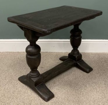ANTIQUE OAK PEG JOINED HALL TABLE, planked cleated end top, substantial bulbous supports, platform feet and cross stretcher, 60 (h) x 71 (w) x 46cms (d)Provenance: private collection Denbighshire