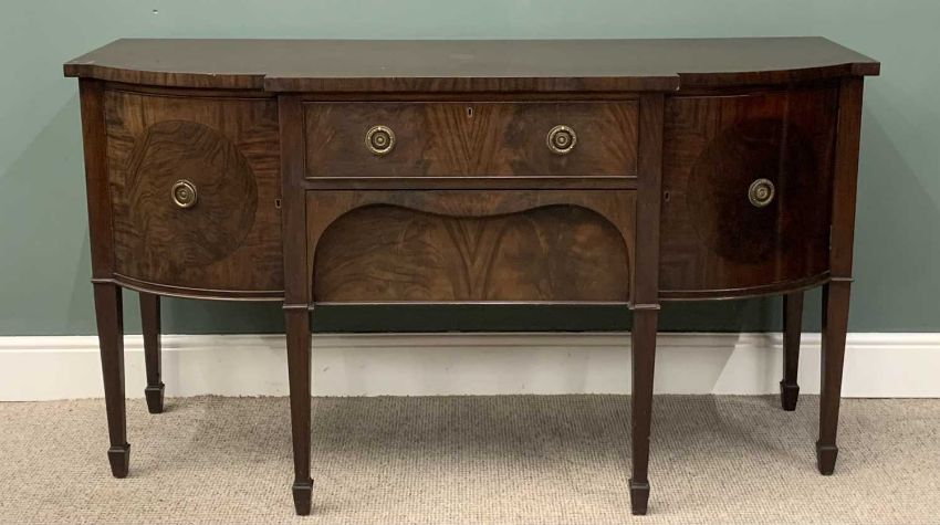 GEORGE IV STYLE MAHOGANY SIDEBOARD, shaped top, two central drawers, twin bow front cupboard doors, interior cellarette and shelves, beaded circular backplates and ring-pull handles, tapering square supports, spade feet, 94 (h) x 167.5(w) x 60.5cms (d)Provenance: private collection Conwy