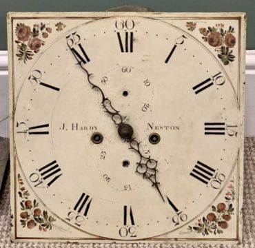 OAK & MAHOGANY LONGCASE CLOCK CIRCA 1830, 13in square painted enamel dial, eight day bell strike movement by J Hardy, Neston, 207 (h) x 50 (w) x 23cms (d) (no weights or pendulum)Provenance: private collection Conwy