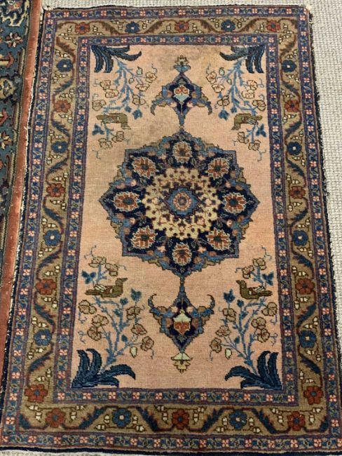 THREE WILTON & OTHER EASTERN STYLE WOOLEN RUGS, the Persian pattern Wilton in 100% worsted wool, traditional central medallion and floral panel, multi bordered edge, 183 x 92cms, red and blue ground rug, central repeating pattern block, single wide border, tassled ends, 152 x 76cms, pink and colourful ground rug, central medallion, opposing bird pattern corners, triple bordered edge, 130 x 84cmsProvenance: private collection Conwy
