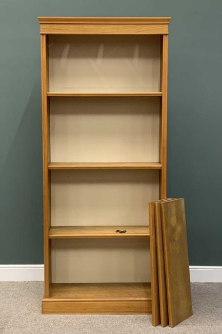 TALL LIGHT WOOD MODERN BOOKCASE, top light apertures, six interior adjustable shelves, plinth base, 241 (h) x 105 (w) x 37cms (d)Provenance: private collection Conwy