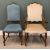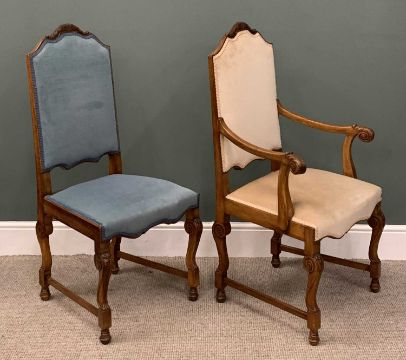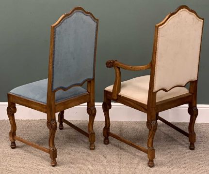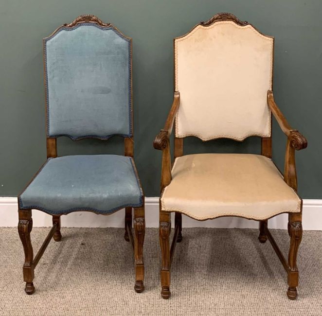 TWO CARVED WALNUT SIDE CHAIRS comprising armchair, cream fabric upholstered back and seat, leaf carved shaped crest rail, scroll leaf carved arm ends and supports, straight bar stretchers, 115cms (h), 62cms (w), 48cms (d), open side chair, blue upholstered back and seat, matching carved crest rail, supports and stretchers, 114cms (h), 62cms (w), 46cms seat depthProvenance: deceased estate Denbighshire