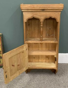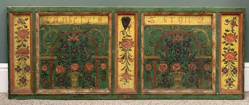 EUROPEAN HANDPAINTED FLORAL PANEL & PINE WALL CABINET, 48 (H) x 125cms (W) and 89 (H) x 44.5 (W) x 18cms (D) measurements respectivelyProvenance: private collection Conwy