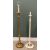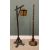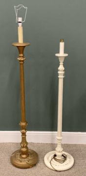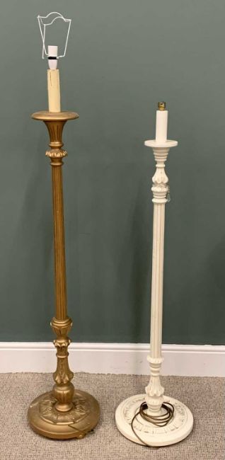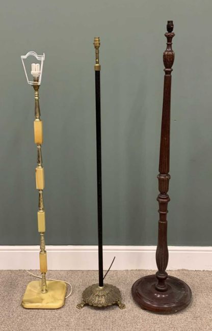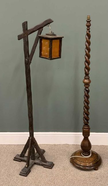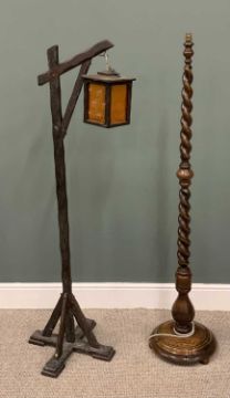 SEVEN VARIOUS STANDARD LAMPS, to include an oak barley twist example, circular base, turned bun feet, 61cms (h), giltwood carved reeded example, 149cms (h), oak hanging lantern example, 160cms (h), etc, with five various lamp shadesProvenance: private collection Conwy