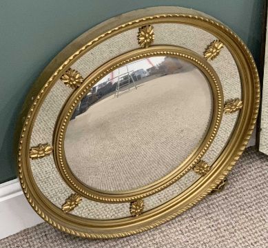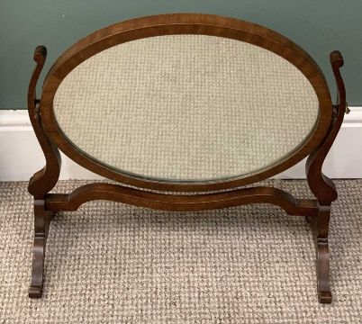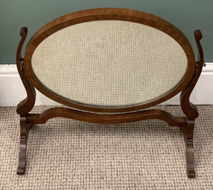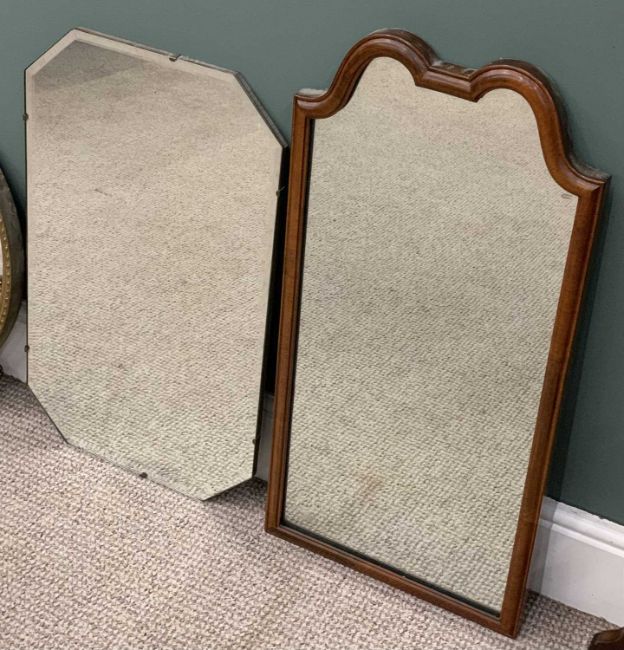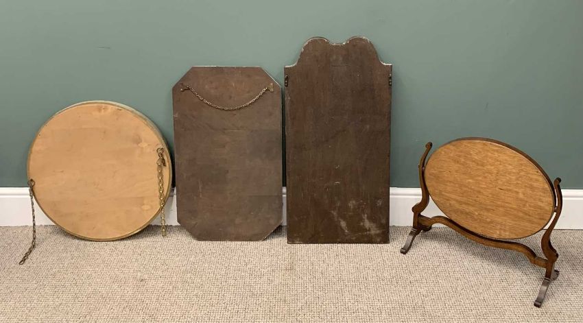 THREE VARIOUS VINTAGE WALL MIRRORS & A TOILET MIRROR, comprising rectangular, unframed bevelled edge example, 69cms (h), 40.5cms (w), Regency gilt style convex circular mirror, 55cms (diam), shaped top walnut framed mirror, 79cms (h), 39cms (w), mahogany oval framed toilet mirror on stand, 49cms (h), 63cms (w)Provenance: deceased estate Denbighshire