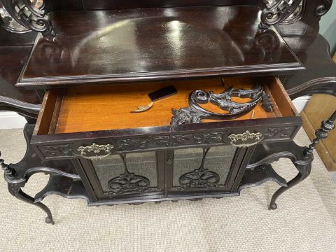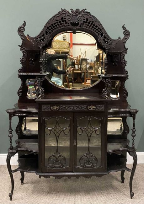 VICTORIAN MAHOGANY MIRRORED SIDE CABINET, shaped bevel edged central mirror, smaller lower tier mirrors, carved fretwork detail throughout, shaped upper and lower shelves, twin glazed central cabinet doors, Queen Anne supports, 202 (h) x 137 (w) x 41cms (d)Provenance: private collection Denbighshire