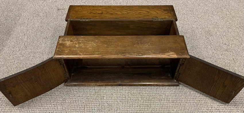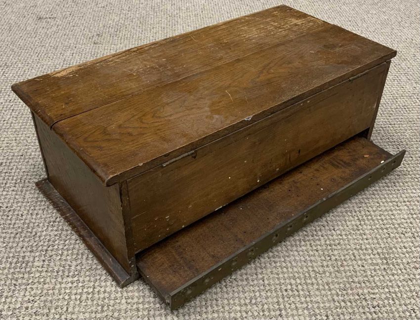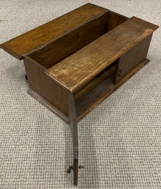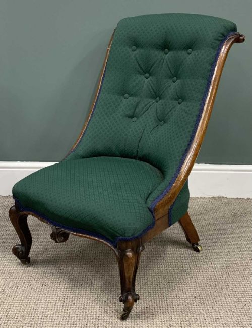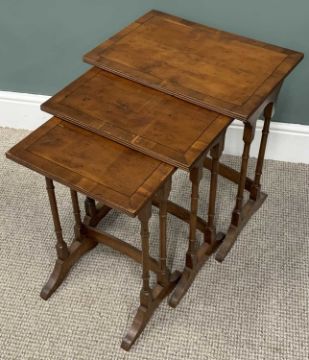 THREE ITEMS OF VICTORIAN & LATER FURNITURE, comprising carved walnut nursing chair, button back upholstered, knurled end front supports, brass castors, 84 (h) x 53 (w) x 40cms (seat d), cross banded yew wood nest of three occasional tables, slender turned supports, 56.5 (h) x 50 (w) x 35cms (d) the largest, two door table top oak box, 22 (h) x 60 (w) x 30cms (d)Provenance: private collection Conwy