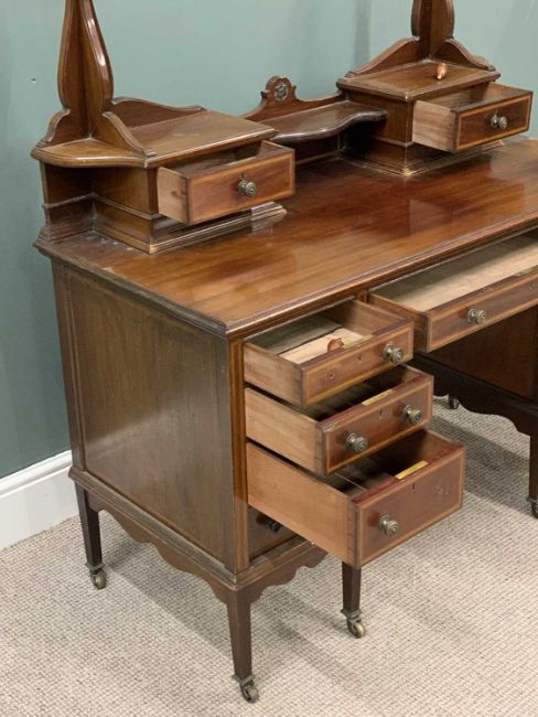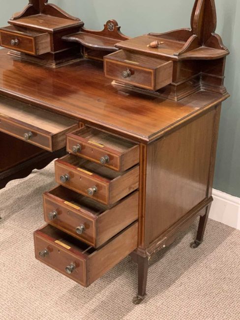 MAHOGANY DRESSING TABLE circa 1900, lacking mirror, boxwood string inlay, two drawer top section with central shelf, central long draw, flanking banks of four opening drawers, turned brass knobs, tapering square supports, brass castors, 137 (overall h) x 123 (w) x 56cms (d)Provenance: private collection Conwy