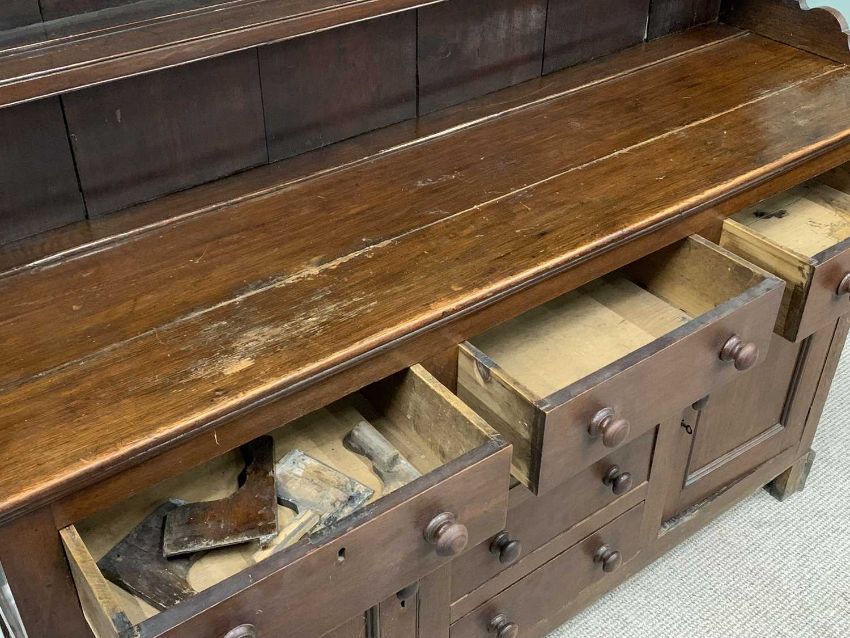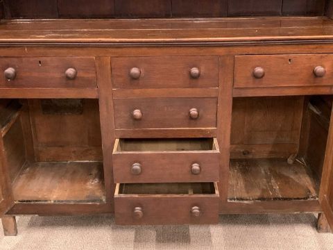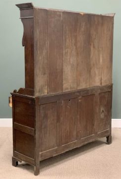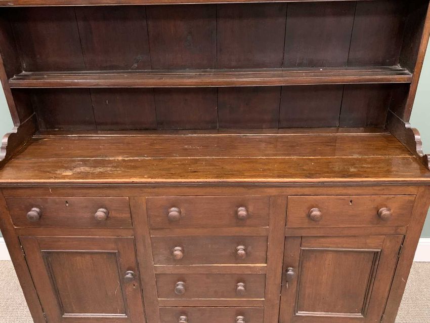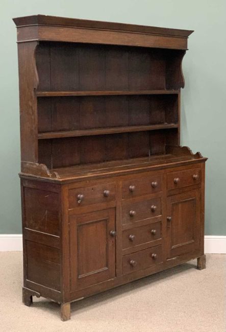 NORTH WALES OAK & PINE DRESSER circa 1870, shaped sided plate rack, shelves, wide boarded back, panel sided base, T arrangement of six opening pine lined drawers, twin cupboard doors, turned wooden knobs, corner bracket feet, 98 (h) x 163 (w) x 48cms (d)Provenance: private collection Conwy