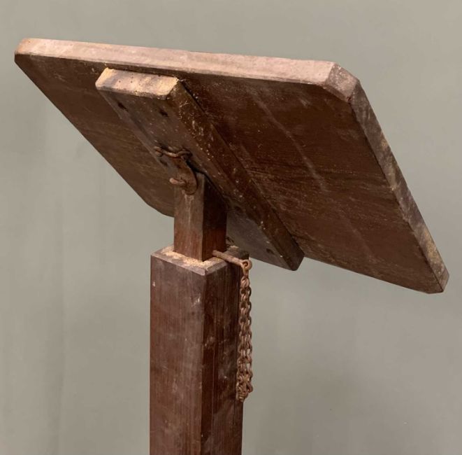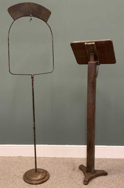 VINTAGE RISE & FALL LECTERN / RETAILER'S STANDING SIGN the metalwork sign with 'Antiques' in Gothic script, 148cms (h) and 184cms (h) respectivelyProvenance: private collection Conwy